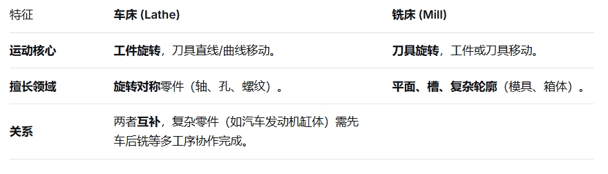 要理解车床的独特作用,可与铣床(刀具旋转)对比: