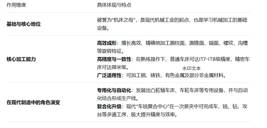 车床是机械制造的“基础母机”,核心作用是通过旋转工件、固定刀具进行切削,加工出旋转对称的零件(如轴、盘、套)。下表清晰展示了其核心作用与特点: